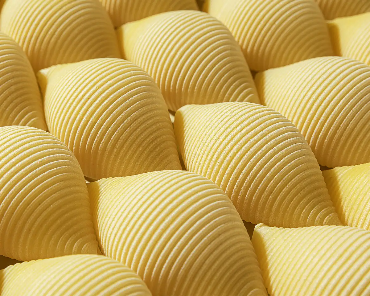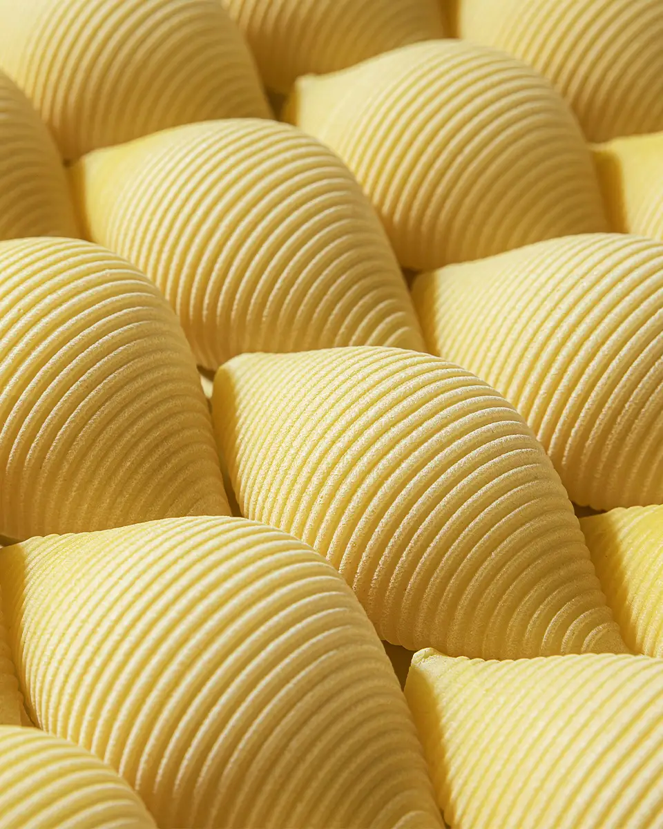 Avec un grand souci du détail, les Allemandis façonnent des pâtes à partir de la meilleure semoule de blé dur, qui assure une mâche parfaite. Cette texture unique est obtenue par le pressage sur des moules en bronze, qui donnent aux pâtes une surface rugueuse sur laquelle les sauces ne font que danser. Un séchage doux permet de conserver toute la saveur.