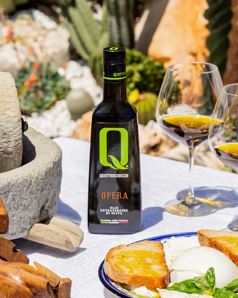 Flasche Quattrociocchi Olivenöl Extra Vergine 'Opera' neben zwei Gläsern mit Olivenöl und geröstetem Brot mit Mozzarella auf weißem Tischtuch im Freien