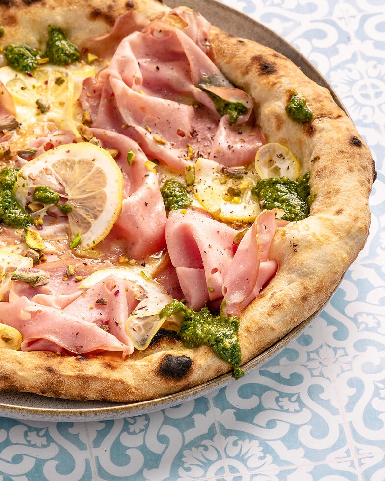 - Schritt 5Die fertige Pizza aus dem Ofen nehmen und sofort mit Mortadella und Zitronenscheiben belegen. Mit gehackten Pistazien und etwas Pistazienpesto verfeinern und servieren.