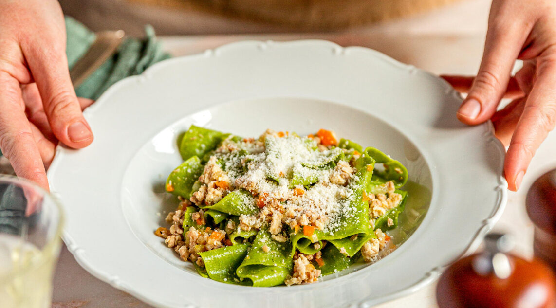 Am besten passt frische Pasta zum weißen Ragù. Da die Sauce selbst nicht viel Farbe mitbringt, bietet sich besonders bunte Pasta an. In diesem Rezept haben wir leuchtend grüne Pappardelle serviert. Gekrönt wurde alles mit extra viel geriebenem Pecorino .