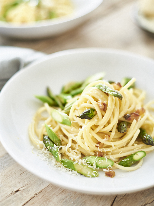 Spargel Pasta in Perfezione! Wenn im Frühling die köstlich grünen Spargelstangen Saison haben, liegt nichts näher als sie mit einem italienischen Klassiker zu verheiraten: der Carbonara.