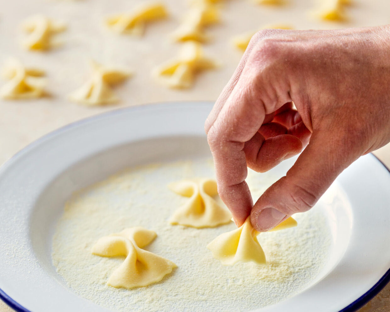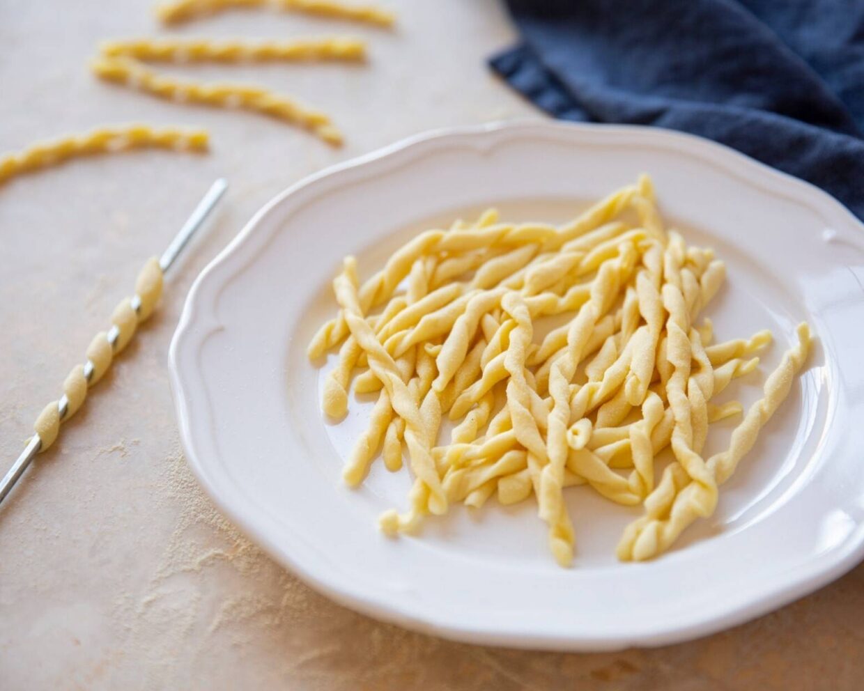 Wenn Sie den Teig erst einmal vorbereitet haben, brauchen Sie für Trofie nur ein Messer, einen rauen Untergrund (Holzbrett), Trockenfläche…