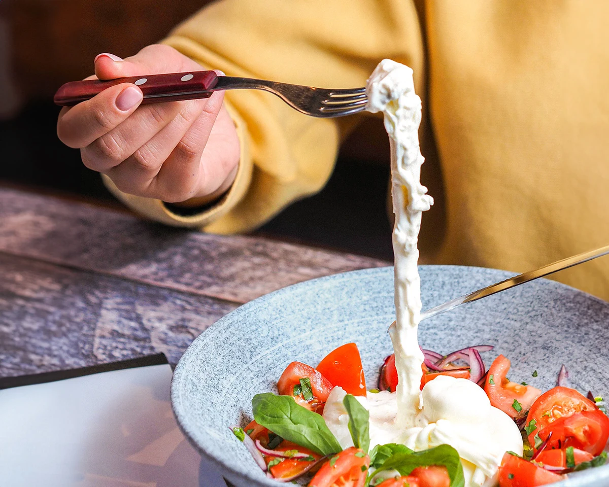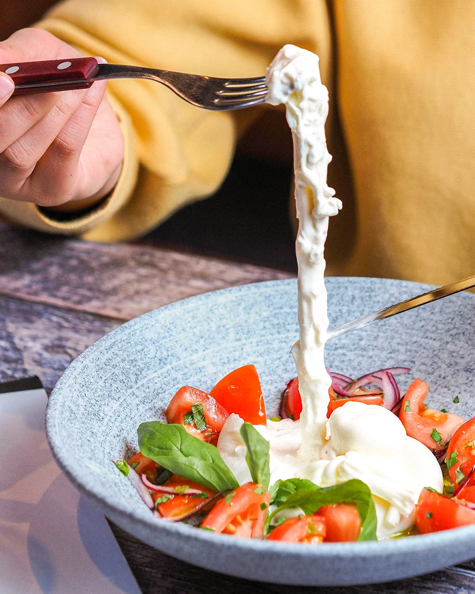 Alles beginnt 1956 im apulischen Dorf Andria. Damals gab es dort kaum Kühlschränke. Um die Haltbarkeit der Sahne zu verlängern, verpackte man sie in einem kühlen Säckchen aus Mozzarella und taufte den neuen Käse Burrata.