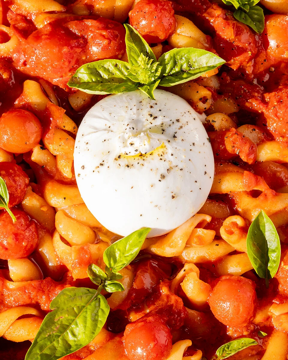 Ganz klassisch servierst du sie mit Tomatenscheiben, Basilikum und bestem Olivenöl. Oder du gibst eine Kugel als Krönung auf Pizza und Pasta. Auf Antipastitellern wirkt sie ebenfalls beeindruckend. Wenn du sie bei Raumtemperatur servierst, entfaltet die Burrata ihre Aromen komplett.