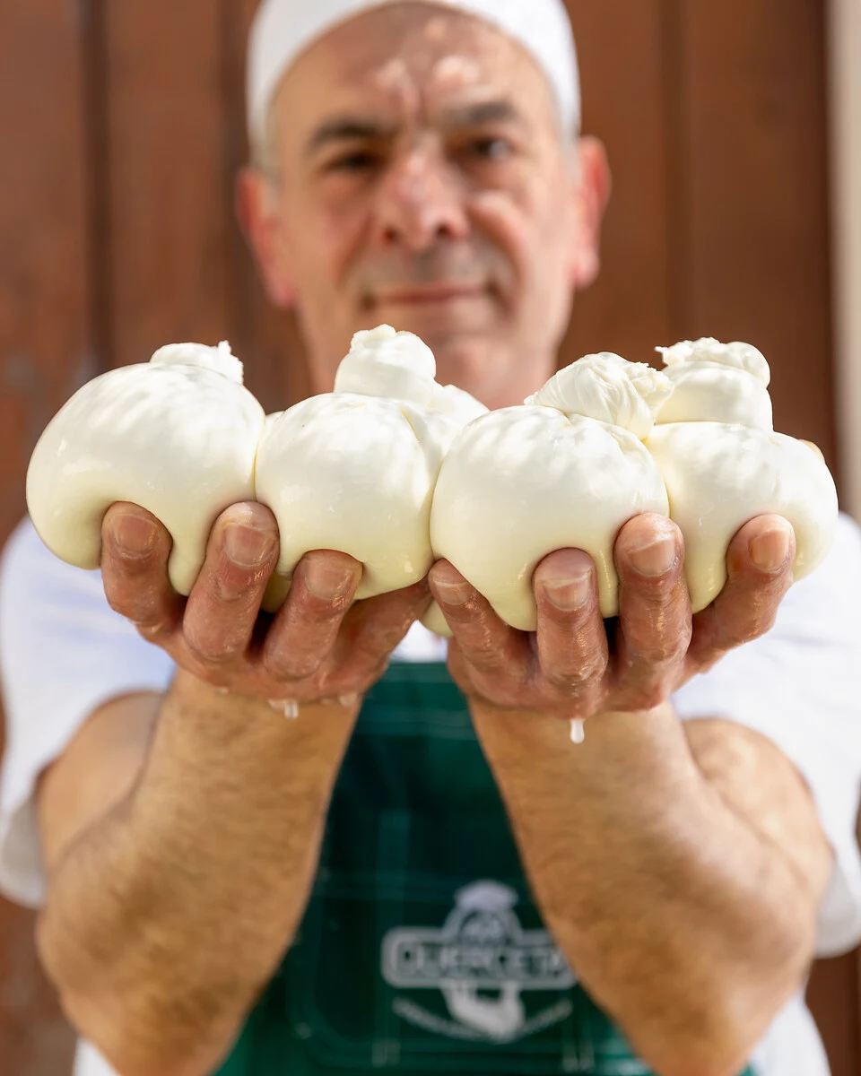 Heute bieten wir Gustinis dir Burrata von Biobauer Gianluca Gigante aus Apulien an. Am Tag verlassen höchstens 200 handgezogene Käse-Säckchen seinen Hof. Bio, versteht sich. Die Milch stammt von Kühen, die das ganze Jahr über auf den hofeigenen Weiden lebenIn diesem Video und diesem hier kannst du selbst vorbei schauen.
