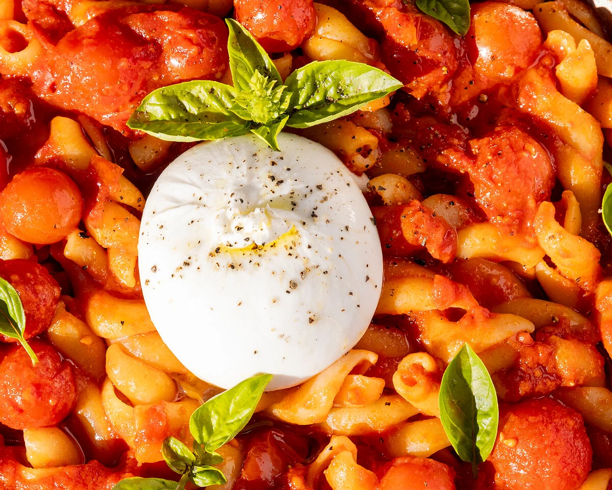 Burrata ist ein milder italienischer Frischkäse aus Kuhmilch, der auf den ersten Blick wie klassischer Mozzarella wirkt. Burrata ist aber immer gefüllt mit cremig-dicker Sahne und zarten Mozzarellafäden. Burrata bringt sofort Raffinesse auf den Teller.