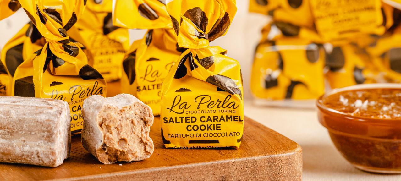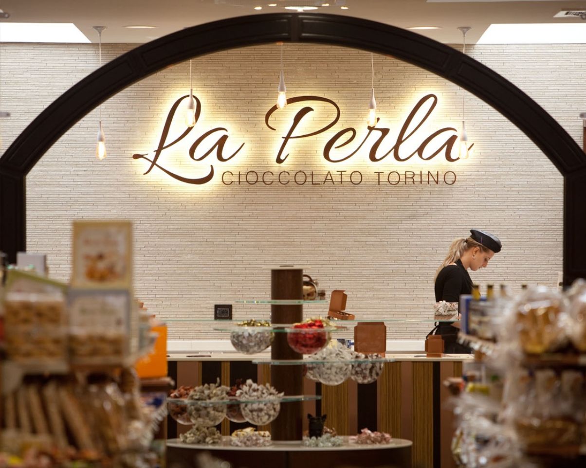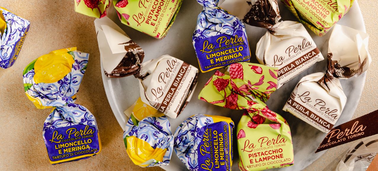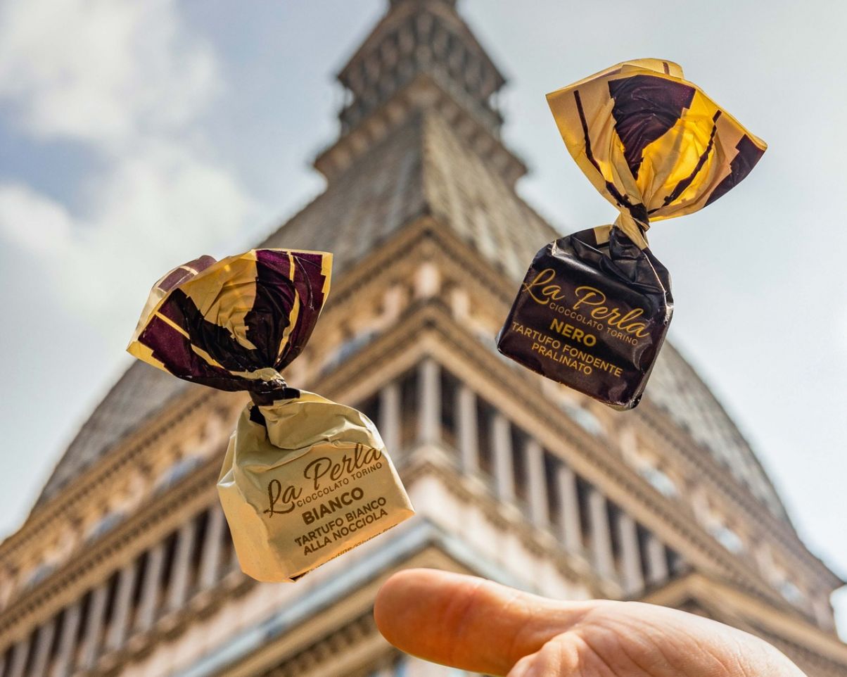 Die Silhouette Turins ziert nicht nur die hübsch gestalteten Verpackungen, auch die inneren Werte der La Perla Kreationen interpretieren die Turiner Schokoladen-Tradition - denn in den alten Gassen dieser Stadt wurde der dunkle Gianduja-Nougat aus gerösteten und gemahlenen Haselnüssen erfunden.