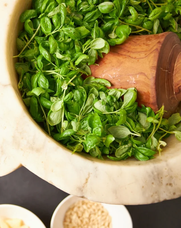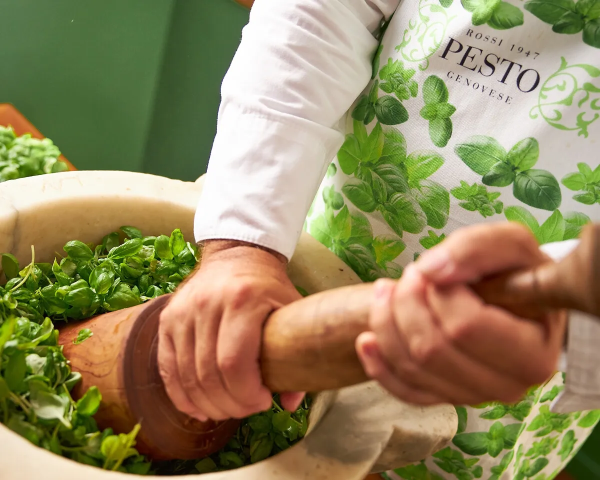 Wenn in seiner Manufaktur Rossi 1947 eine Bestellung für frisches Pesto reinkommt, sieht man ihn mit einem hölzernen Stößel vom Format eines kleinen Kirchenglockenklöppels zu seinem gigantischen Marmor-Mörser schreiten. Dieser stand früher in einem Kloster. Roberto vermutet, dass die Mönche darin Medizin zubereiteten. Mit der Kraft beider Arme wird nun gestampft: Nur im Mörser entfaltet sich perfektes Pesto, versichert Roberto. Mixer kommen ihm nicht ins Haus, denn beim Mixen entsteht Hitze, die den Geschmack verändert.