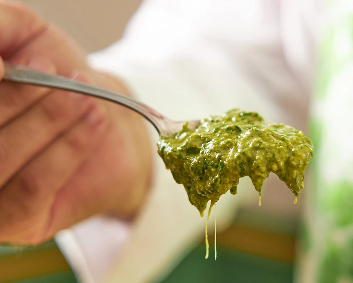 A propos Geschmack: Roberto schwört darauf, nur die ersten Blättern des Basilikums zu verwenden. Dass es nicht irgendein Basilikum sein darf, sondern das regionale Basilico Genovese D.O.P., ist da nur konsequent. Dazu kommen 24 Monate gereifter Parmigiano, sardischer Schafskäse, ligurische Pinienkerne, regionales Extra Vergine und Knoblauch aus Vessalico, einem 300-Seelen-Dorf in den ligurischen Bergen.