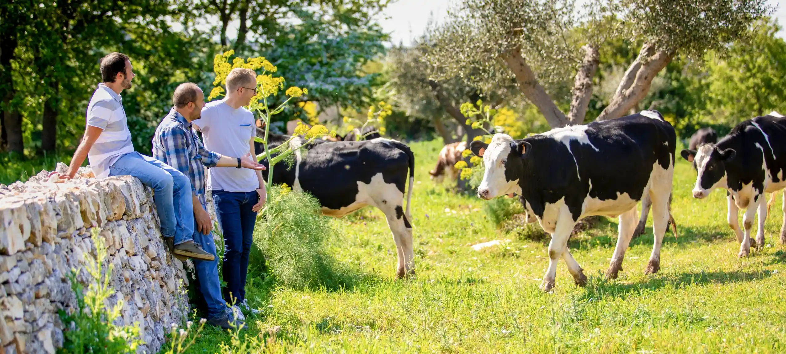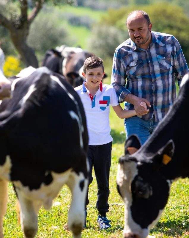 Le père et le grand-père de Gianluca étaient déjà éleveurs de bovins. Ils élevaient des bovins Frisona, qui donnent beaucoup de lait. Gianluca, lui, mise sur les Montbéliardes. Ces vaches donnent peu de lait, mais celui-ci a un goût exceptionnel. Elles sont traites deux fois par jour à la ferme.