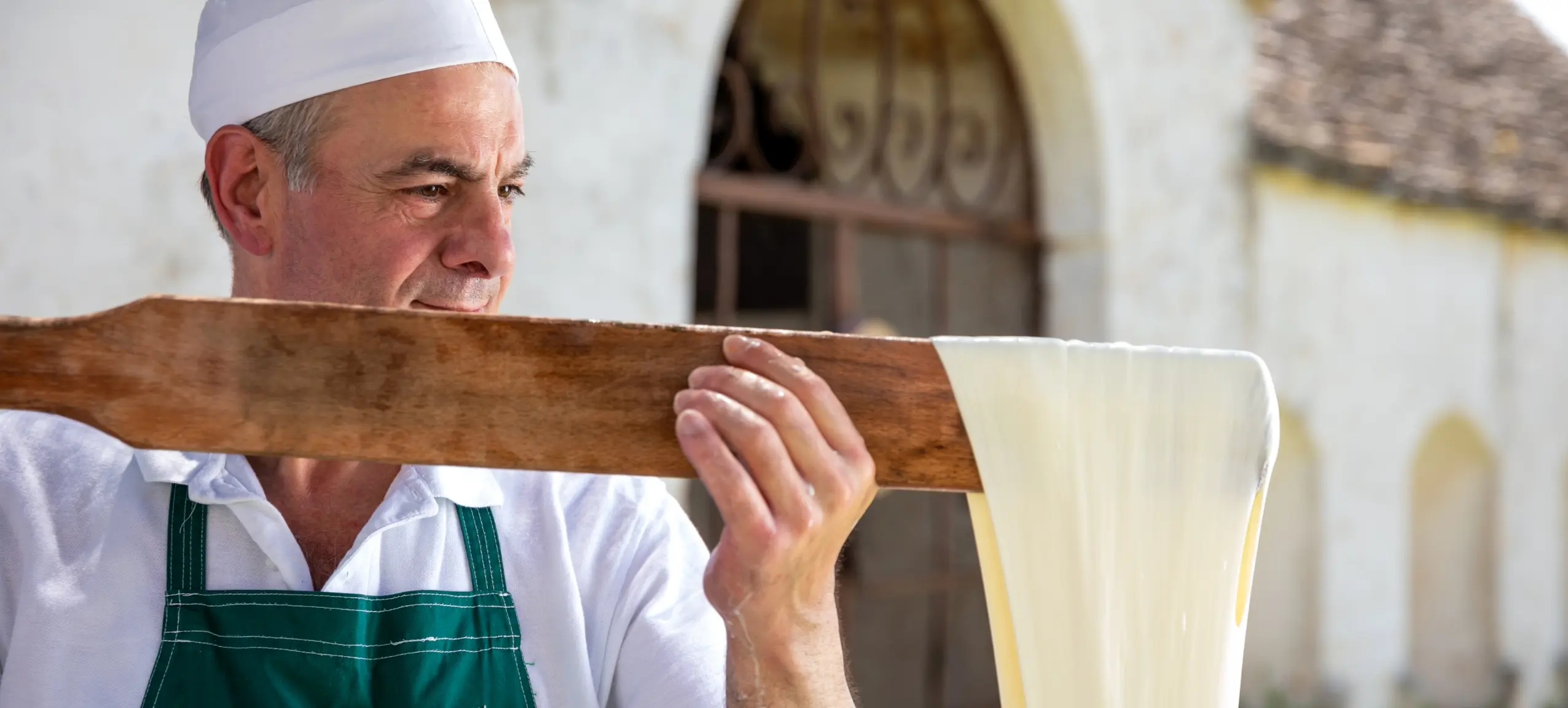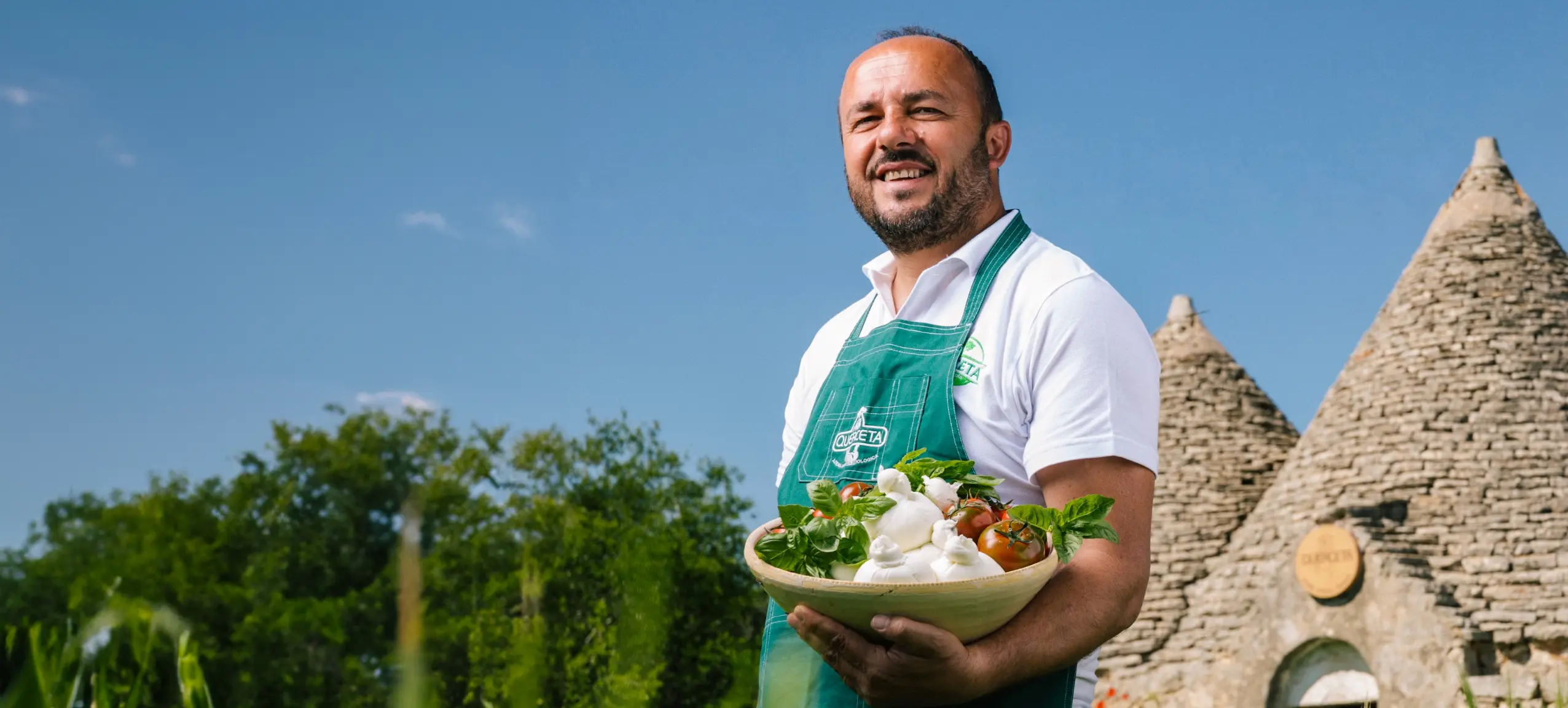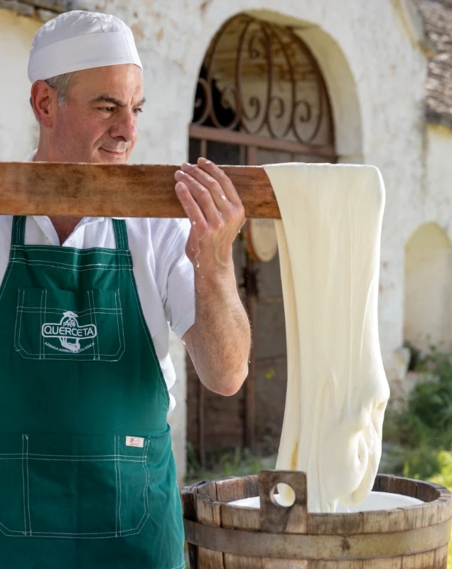 C'est ici, près de Bari, que vous trouverez la ferme de production biologique Querceta. Gianluca Gigante la dirige avec Amalia, sa femme. Ils produisent eux-mêmes presque tout ce dont ils ont besoin pour le plaisir quotidien : des céréales au lait, en passant par le fromage et la charcuterie. L'accent est mis sur les fromages traditionnels comme la Mozzarella, la Burrata, la Ricotta, la Scamorza et le Provolone.