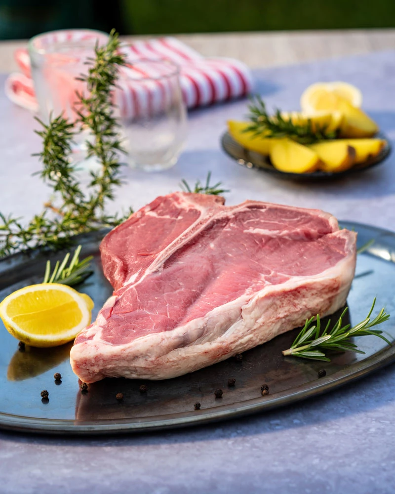 Non, la Bistecca alla Fiorentina n'est pas de bœuf de Chianina. En concertation avec Stefano Falorni, le maître-boucher de l'Antica Macelleria Falorni, nous avons décidé de vous proposer de la viande tout aussi qualitative des races Limousine et Charolaise. La raison en est que la viande de Chianina n'est disponible qu'en très petites quantités et qu'elle est par conséquent beaucoup plus chère.