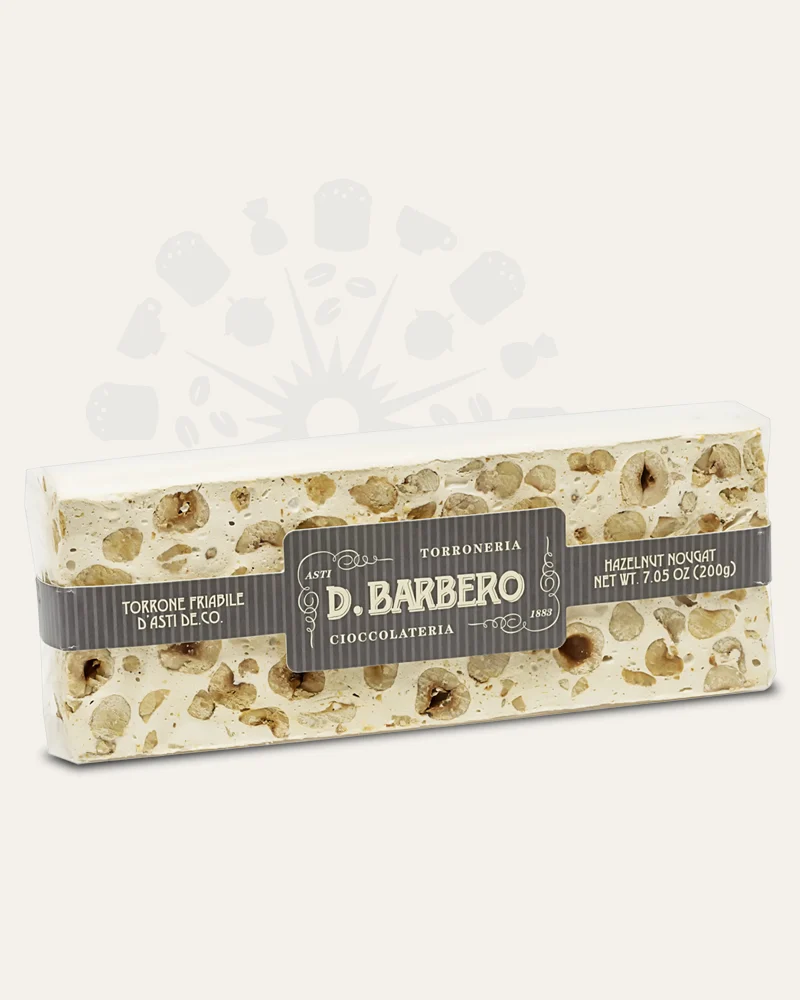 Noisettes du Piémont IGP 51 %, miel, sirop de glucose, blanc d'œuf, gaufrettes (fécule de pomme de terre, eau, huile d'olive et huile de tournesol), vanille naturelle de Madagascar, amidon de maïs.