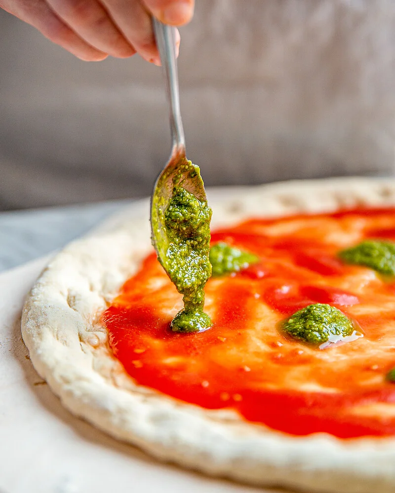 Wenn ich mir die Zutatenliste anschaue, frage ich mich welchem Chemielabor diese Zubereitung nach Pesto Art entflohen ist: Natives Olivenöl Extra 40%, Genueser Basilikum DOP 28%, Cashewkerne, Molkepulver, Käsezubereitung (Käse, Molke, Salz, Schmelzsalz: Natriumphosphat), Salz, Knoblauch, Pflanzenfasern, Grana Padano DOP (Milch, Salz, Lab, Lysozym aus Ei), Pinienkerne, Säureregulator: Zitronensäure. Genovesen Pesto besteht aus Olivenöl, Basilikum, Pinienkerne und Salz. Ihr macht doch euren Pizzateig Aurich nicht 13 Zutaten sondern aus Mehl, Wasser, Salz und Hefe.