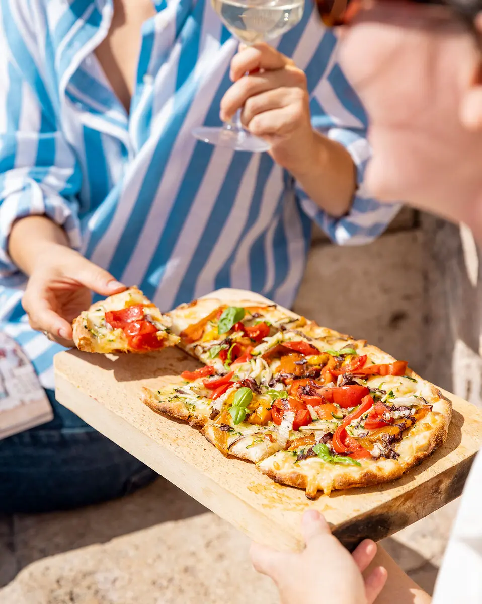 Notre Pinsa est préparée avec de la Pasta Madre, c'est-à-dire du levain, afin d'en extraire encore plus d'arôme. Elle est encore préparée à la main. La pâte peut lever pendant 72 heures, puis la Pinsa est cuite dans un four traditionnel en pierre. Elle devient ainsi croustillante et bien dorée.