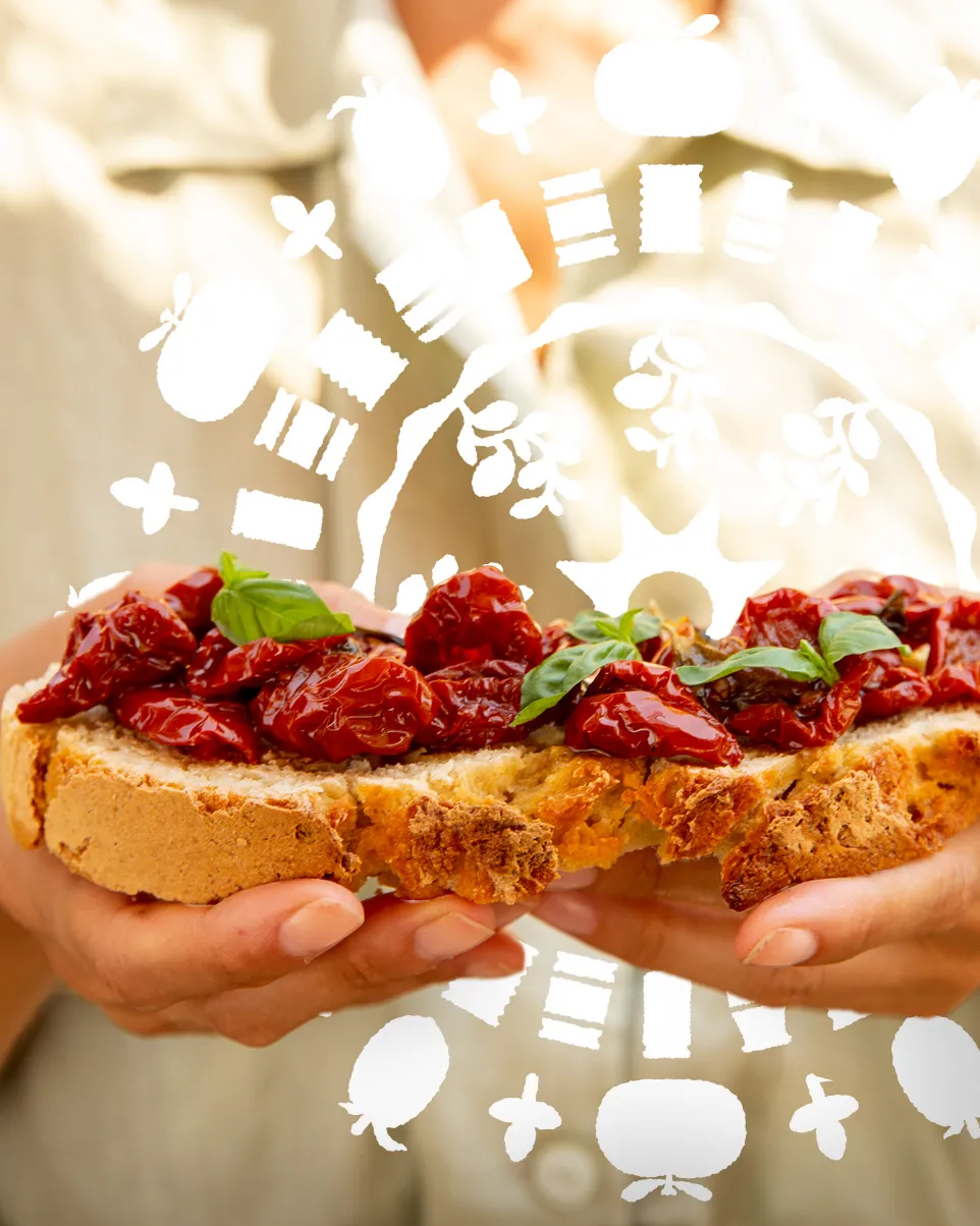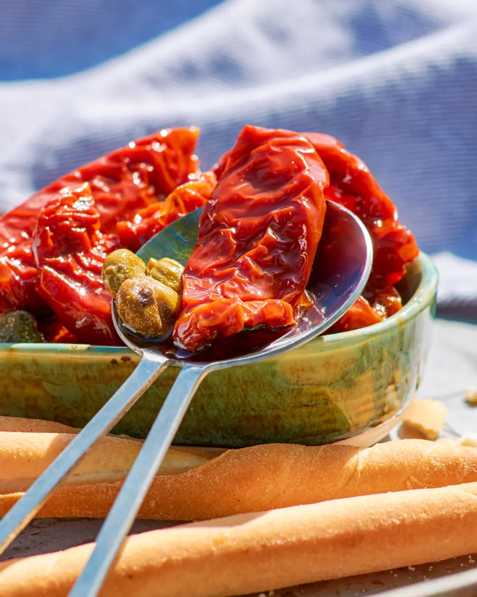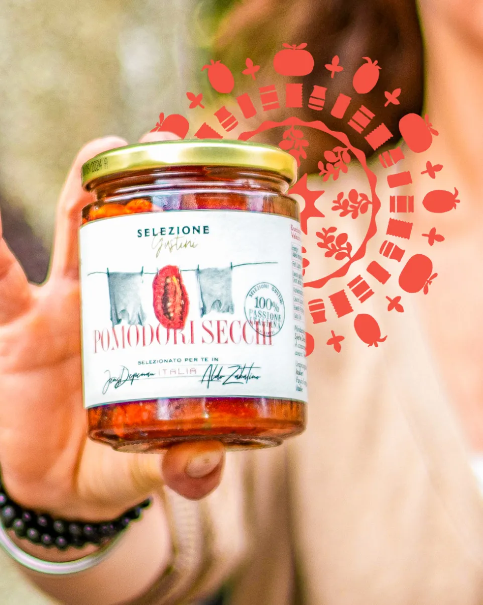 Sott'olio signifie littéralement « sous l'huile ». Les Pomodori, lentement séchées, sont recouvertes d'huile. Des épices méditerranéennes apportent ensuite le goût caractéristique. Une forte dose de vinaigre de vin blanc vient réveiller la fine acidité.