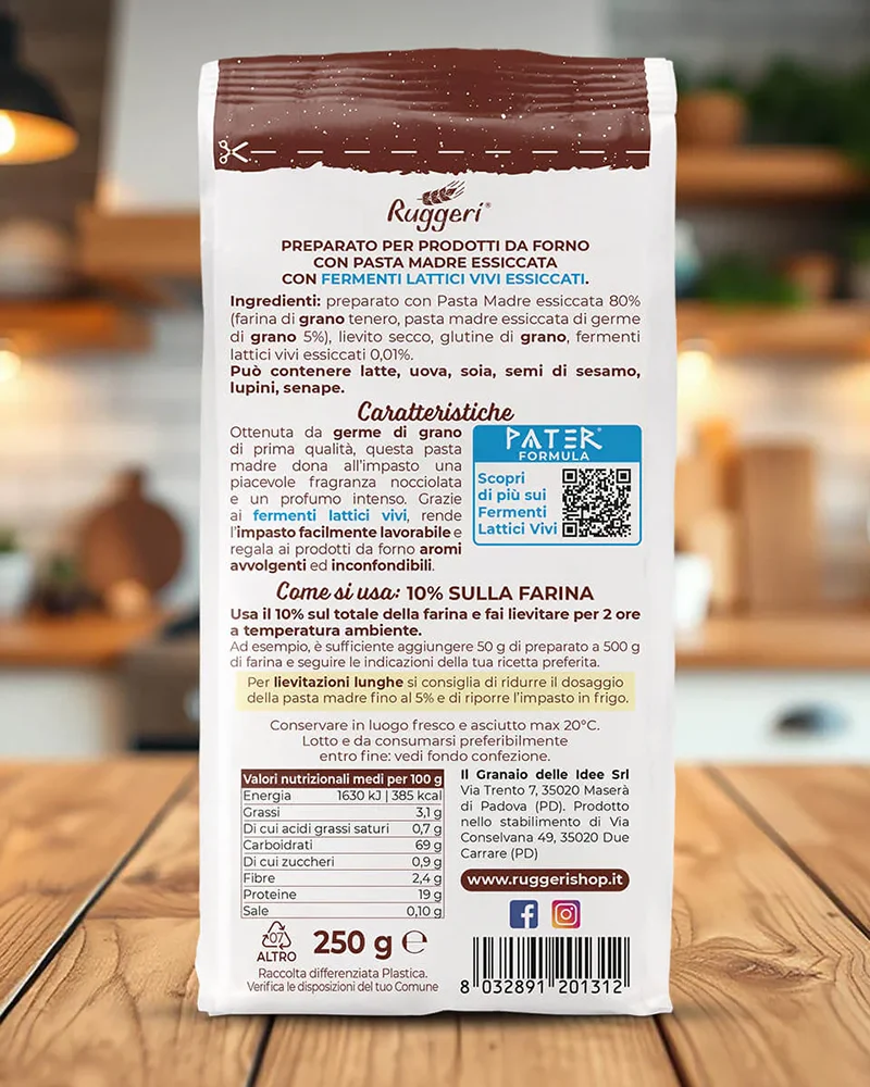 Die Mischung enthält lebende Kulturen und hat daher nur eine begrenzte Mindesthaltbarkeit. Sie ist somit nicht zum Lagern und Bevorraten in größeren Mengen geeignet.| Verantwortlicher Lebensmittelunternehmer: | Ruggeri Srl, Via S. Crispino 82, I - 35129 Padova |