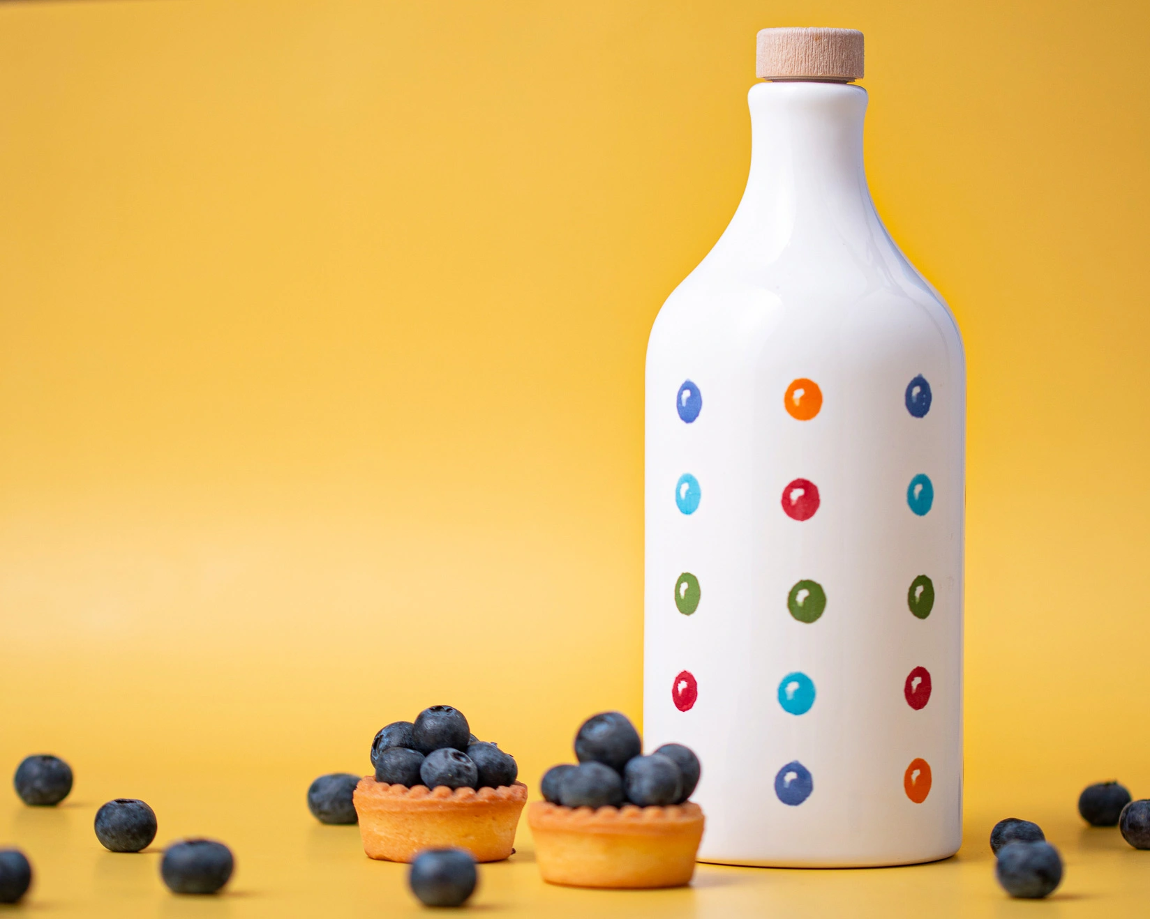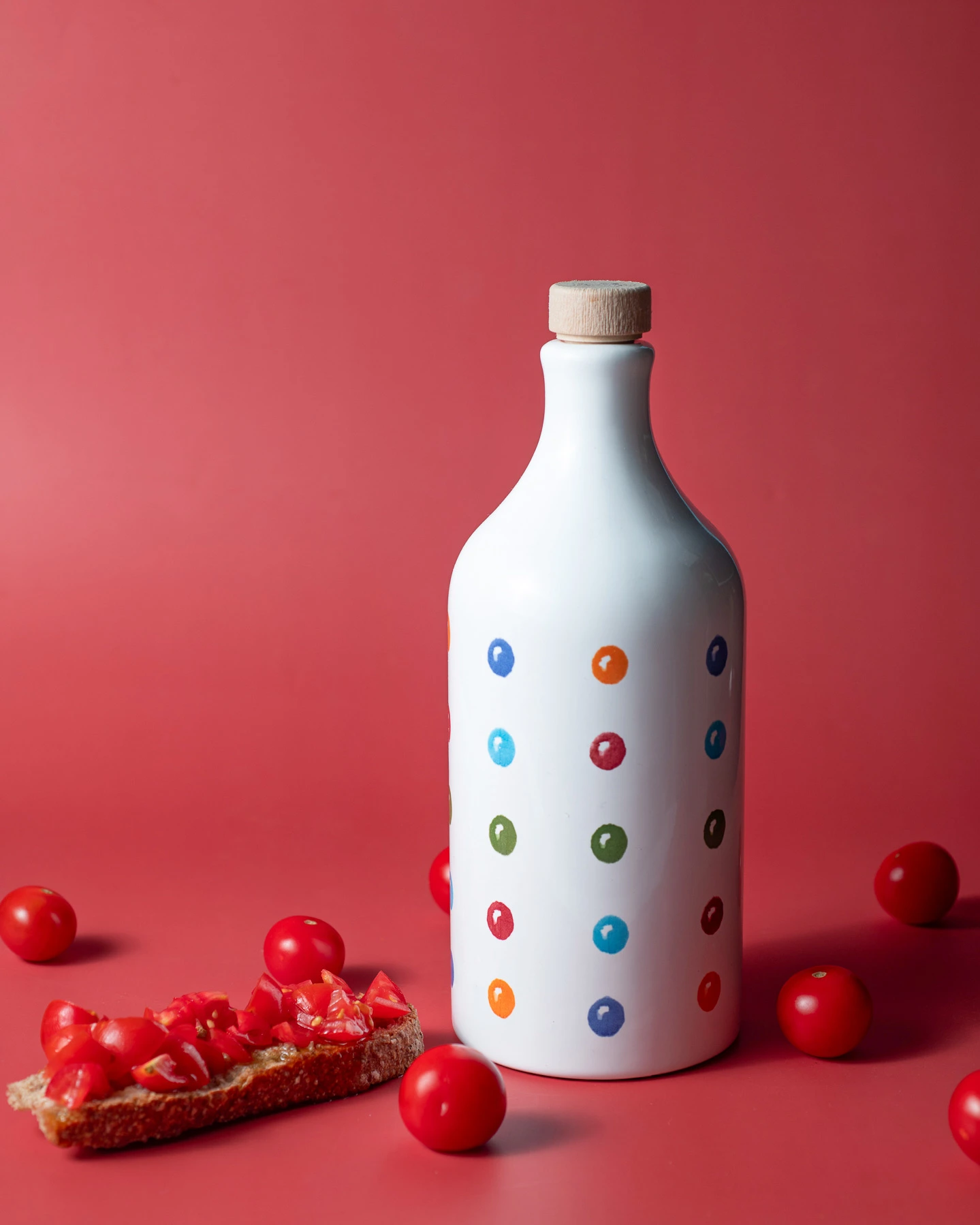 Leuchtend bunte Punkte bringen eine große Portion Dolce Vita auf Deinen Tisch! Die wunderschöne, handgemachte Flasche enthält ein sehr gutes goldgelbes Olivenöl mit leuchtend grünen Reflexen und lebendigen Aromen von Tomate, Rucola und Artischocken.
