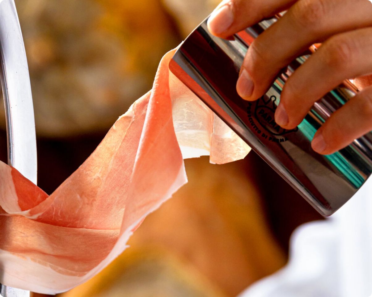 Für den echten Schinken aus Parma dürfen nur spezielle Schweine verwendet werden. Er Parmaschinken wird nur gesalzen und dann lange an der Luft getrocknet. So entstehen die einzigartigen Aromen, die ihn so lecker machen.