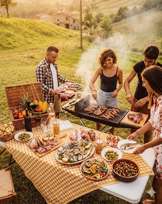 Da ist zum Beispiel die Salsiccia, die italienische Bratwurst: würzig, deftig und in Italien ein fester Bestandteil jedes Grillabends. Oder die Bistecca alla Fiorentina, das legendäre T-Bone-Steak aus der Toskana – allerbeste Qualität, puristisch zubereitet. Auch Fisch gehört selbstverständlich dazu: ganze Doraden oder Garnelen. Und beim Gemüse gilt: weniger ist mehr. Zucchini, Auberginen und Paprika werden mit gutem Olivenöl und etwas Meersalz gegrillt – mehr braucht es nicht.