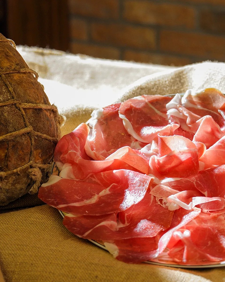 Der Culatello ist das Filetstück des Schinkens. Er wird aus dem besten Teil der Oberschenkelmuskulatur in der Schweinekeule geschnitten. Das Fleisch ist nah am Knochen besonders zart. Es hat einen intensiven, delikaten Geschmack.