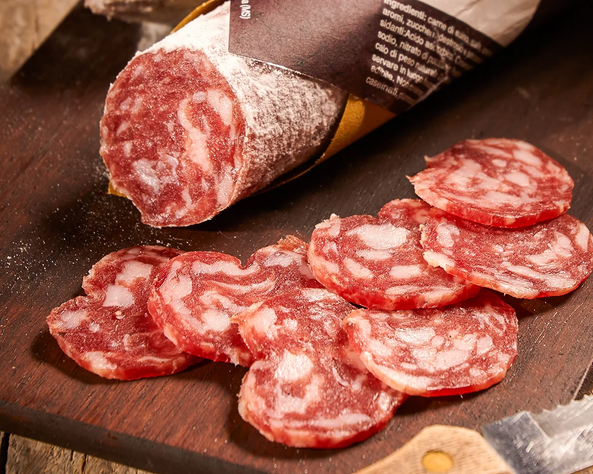 Diese Strolghino Salami macht süchtig! Das ist bisher die beste Salami, die ich je probiert habe. Leider ist sie nicht lange haltbar, sodass nur geringe Mengen bestellt werden können. Aber damit kann ich bei dem tollen Geschmack leben.