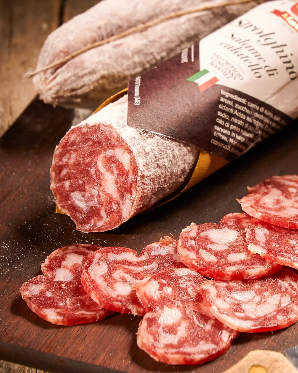 Strolghino ist eine Salami mit einem Durchmesser von etwa 4 Zentimetern und einer Länge von etwa 25 Zentimetern. Mit ihrem milden, nussig-süßen Geschmack und ihrem angenehmen Biss wird sie in Italien oft zusammen mit frischem Brot und einem Glas Wein als Vorspeise serviert.